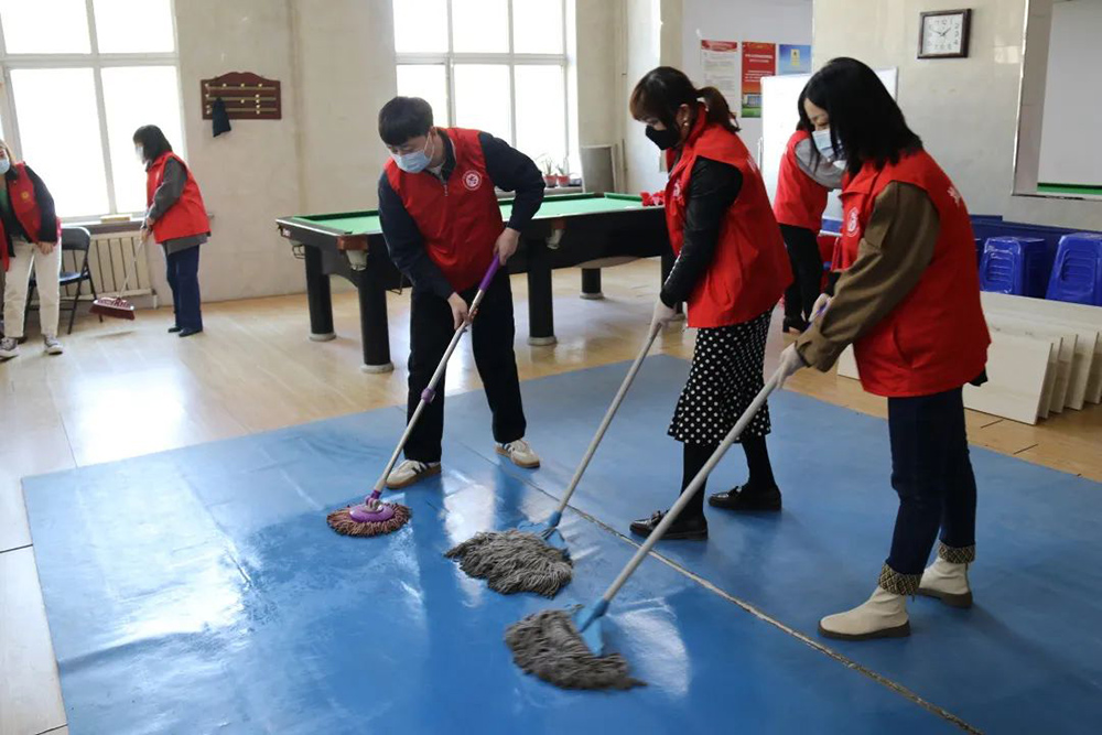 此次活動(dòng)圍繞清掃社區(qū)居民活動(dòng)室展開(kāi)。下午1點(diǎn)30分,航空集團(tuán)25名黨員及入黨積極分子準(zhǔn)時(shí)到達(dá)美地社區(qū),大家迅速穿上醒目的志愿者紅馬甲,分工合作起來(lái)?;顒?dòng)現(xiàn)場(chǎng),志愿者們積極投入到清掃社區(qū)活動(dòng)室地面、清除衛(wèi)生死角、擦拭公共展板等工作中。此外黨員志愿者們?cè)谏鐓^(qū)工作人員的帶領(lǐng)下,搬桌子、掛條幅、擺凳子,圓滿完成美地社區(qū)即將召開(kāi)黨員大會(huì)的前期布置工作。