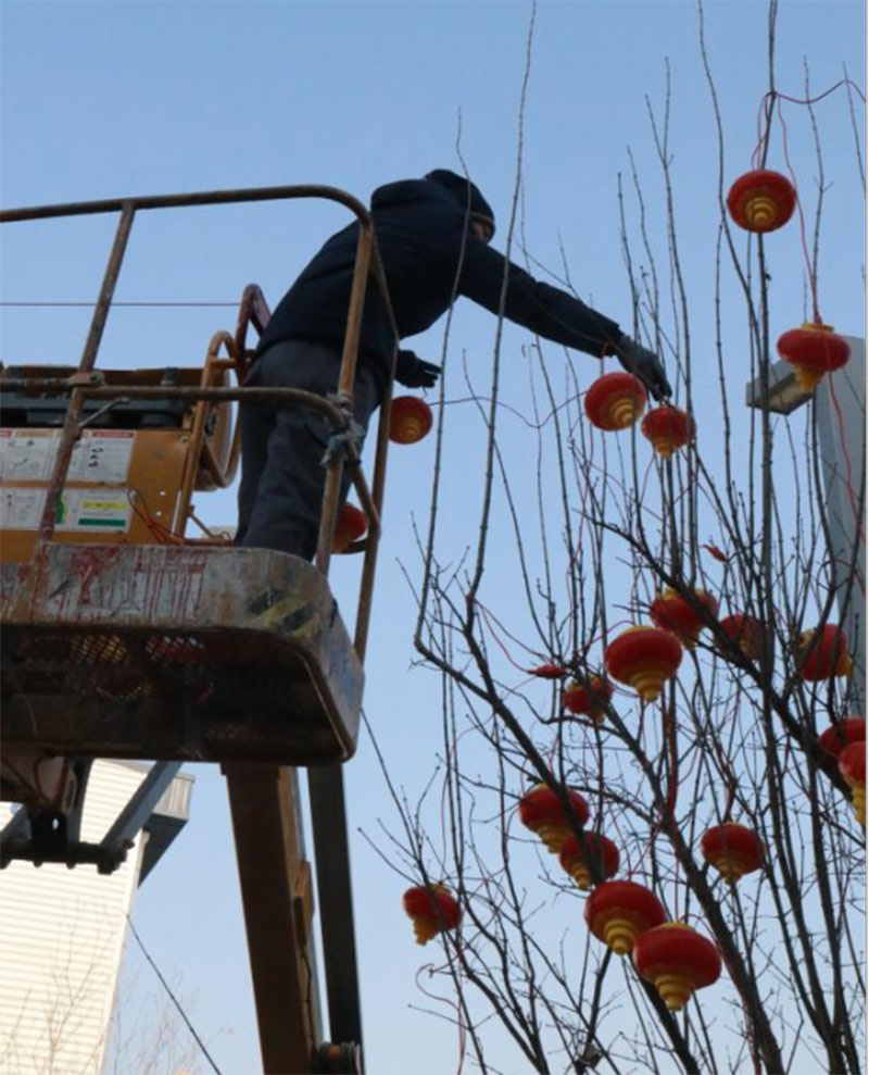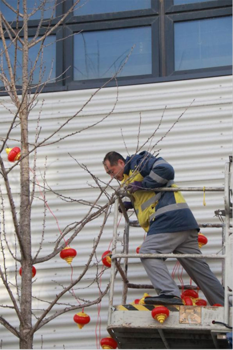 為給園區(qū)營造濃厚的節(jié)日氣氛,給入駐企業(yè)帶來如家般的溫情呵護(hù),沈陽航發(fā)展運(yùn)營管理有限公司物業(yè)團(tuán)隊(duì),在零下二十度的氣溫下,凍紅了雙手,冰覆了睫毛,但他們依然堅(jiān)守,扶梯的扶梯、攀爬的攀爬,將火紅的燈籠掛在園區(qū)主干道、企業(yè)門前。滿街的火紅,是他們對(duì)園區(qū)的熱愛,也是對(duì)工作的執(zhí)著,更是對(duì)崗位責(zé)任的滿滿執(zhí)念。園區(qū)的燈亮了,客戶們洋溢的笑臉,映襯著角落里一道道靚麗的風(fēng)景線,夜幕降臨下,五彩斑斕的彩色燈光給園區(qū)增添了不少喜慶的色彩,也深深的印在了師傅們熱切的心里。